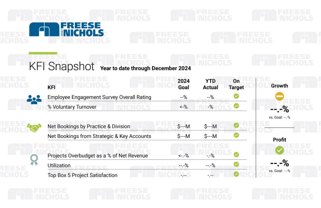 Our Key Focus Indicators (KFIs) are updated and communicated regularly to our entire staff with an emphasis on the idea that everyone on our team contributes to our KFI performance success. They offer a clear, high-level perspective on our company’s direction and how well we are aligning with our goals. Here is an example of how we summarize these for review.