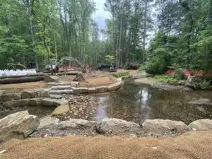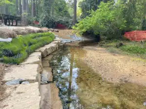 The design for park improvements at the Nature Center included an extended boardwalk to observe Dunwoody’s aquatic resources, an outdoor classroom and repair of stream and wetland issues. The site experienced notable erosion throughout the stream reach, at stormwater outfalls, from pedestrian use, and failing in-stream structures from a previous restoration project. The team’s design approach developed a construction package for stream and wetland improvements that aimed to solve areas of instability with minimal impact on existing functional streambanks. Stabilization required the installation of a rock toe, reconfiguration of existing in-stream structures, installation of log vanes to redirect flow and bank grading. Invasive plant species were removed from existing wetlands, and native vegetation was planted to support the habitat restoration of the native forested wetland.