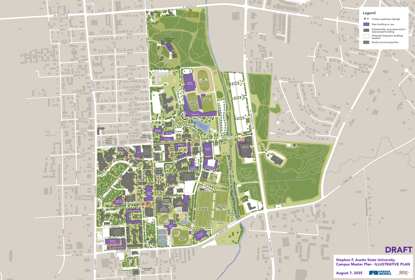 This ambitious plan covered nearly every aspect of the university. The work included facility condition assessments, parking and traffic studies, a utility master plan, a technology plan, an athletics plan, space utilization and enrollment projections and planning-level cost estimating. The plan tied guiding principles directly to the university’s strategic plan, aligning investments with SFA’s goals as the newest member of the University of Texas System.